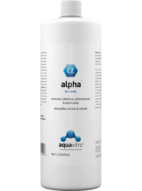 ALPHA™ de Aquavitro® es un acondicionador concentrado para agua salada, que elimina el cloro, la cloramina y el amoniaco.