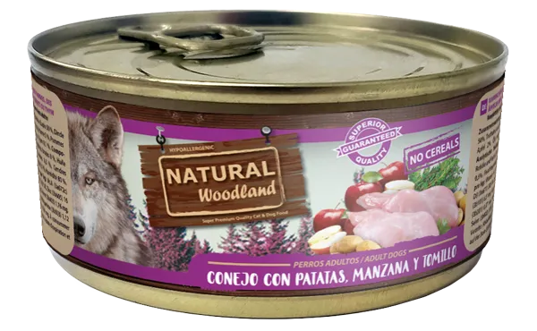 Carne fresca (Conejo 50 %, Pavo y Pollo 10 %), Patatas (5 %), Manzana (2 %), Aceite y grasas vegetales, Tomillo (0,1 %).