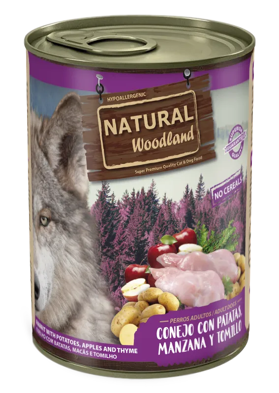 Carne fresca (Conejo 50 %, Pavo y Pollo 10 %), Patatas (5 %), Manzana (2 %), Aceite y grasas vegetales, Tomillo (0,1 %).