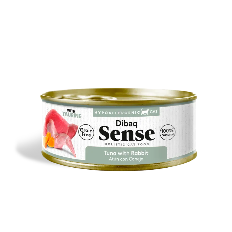 Dibaq Sense Cat Atún con Conejo es una lata sin cereales de 70g para gatos adultos de todas las razas. Elaborada con carnes frescas de atún y conejo, calabaza, prebióticos y extracto de yuca. Receta sin Gluten