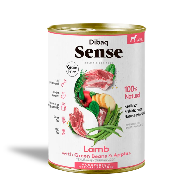 Alimento húmedo 100% natural monoproteico grain free para perros. Elaborado con cordero, judías verdes y manzana. Sin gluten