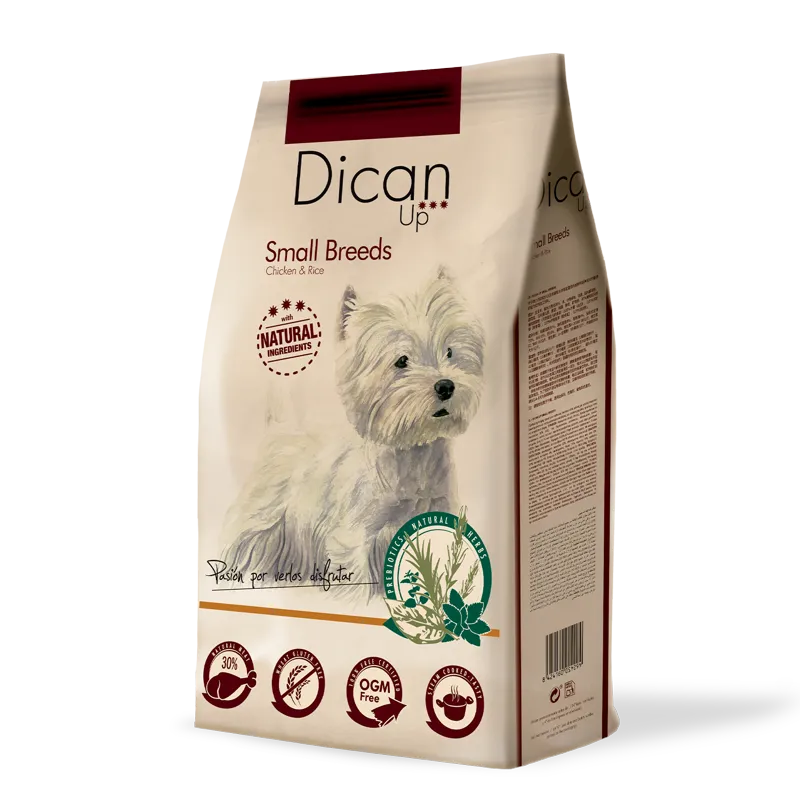 Dican Up es un alimento completo para perros adultos de razas pequeñas con plantas naturales para facilitar la digestión