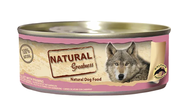 Natural Greatness FILETE DE ATÚN CON GAMBAS es una excelente receta húmeda complementaria, ultraprémium e hipoalergénica desarrollada idealmente como premio o recompensa para perros adultos. Este alimento natural a base de pechuga de pollo troceada de alta calidad contiene únicamente los ingredientes listados: sin aditivos, derivados animales, subproductos o rellenos.