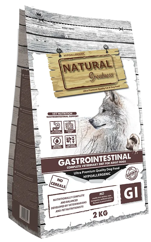 Natural Greatness Gastrointestinal es una receta hipoalergénica, completa y sin cereales destinada a perros adultos de todas las razas con trastornos de la absorción intestinal. Se caracteriza por la presencia de prebióticos FOS y MOS para la mejora en la absorción de nutrientes, así como por una alta digestibilidad gracias a su mayor contenido de sodio y potasio, además de proteínas de alto valor biológico de origen animal.