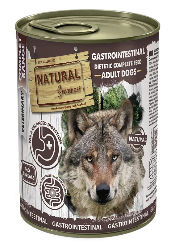 Natural Greatness Gastrointestinal es un alimento húmedo, completo, hipoalergénico y sin cereales formulado para perros júnior y adultos de todas las razas con diarrea aguda o crónica, enfermedad inflamatoria intestinal (EII), gastroenteritis, casos de mala digestión, colitis o anorexia.