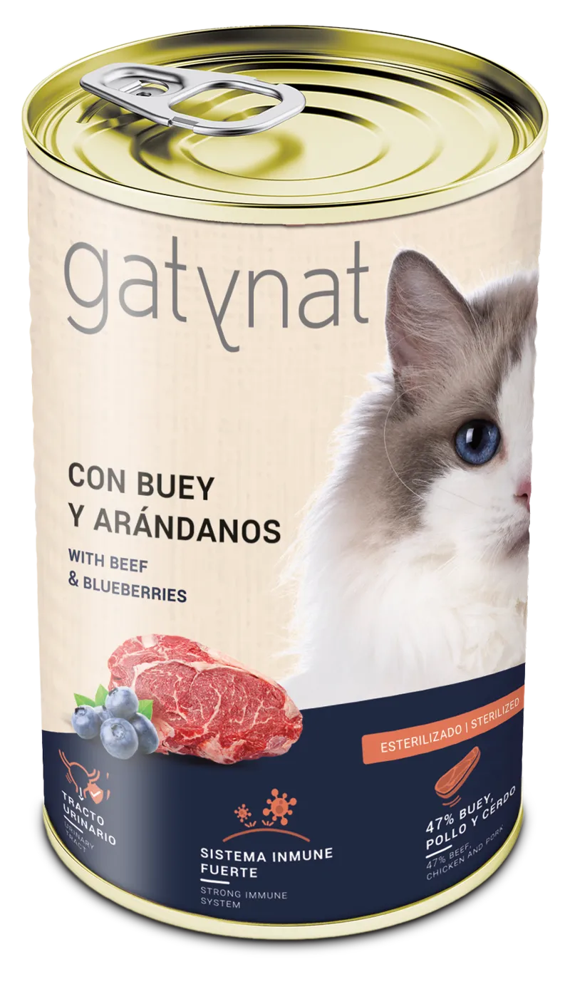 Alimento completo para gatos adultos y gatos esterilizados con buey y arándanos