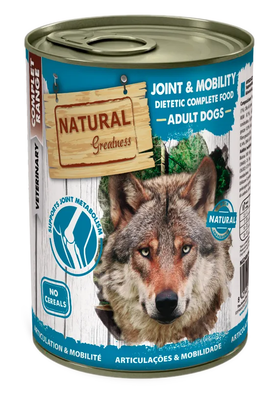Natural Greatness Joint & Mobility es un alimento húmedo, completo, hipoalergénico y sin cereales formulado para perros júnior y adultos de todas las razas que necesitan un apoyo extra para el buen funcionamiento de sus articulaciones. Recomendado como apoyo articular después de un traumatismo o para tratar enfermedades como la osteoartritis.