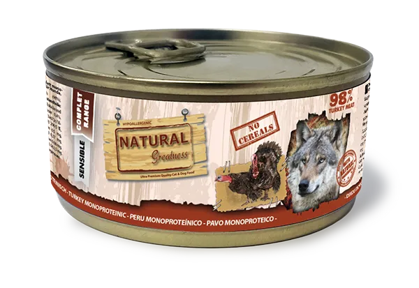 Natural Greatness MONOPROTEICA DE PAVO es una excelente receta húmeda completa, ultraprémium, hipoalergénica y sin cereales desarrollada idealmente para perros adultos con sensibilidad a otras carnes, como el pollo. Este alimento húmedo contiene un 98 % de carne de pavo de alta calidad, siendo esta la única fuente de proteína animal presente en la receta. Es un alimento ideal para una dieta de exclusión, pues facilita la detección de posibles intolerancias alimentarias o alergias.