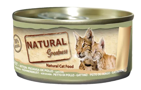Natural Greatness PECHUGA DE POLLO es una excelente receta húmeda complementaria, ultraprémium e hipoalergénica desarrollada idealmente como premio o recompensa para gatos adultos. Este alimento natural a base de pechuga de pollo troceada de alta calidad contiene únicamente los ingredientes listados: sin aditivos, derivados animales, subproductos o rellenos.
