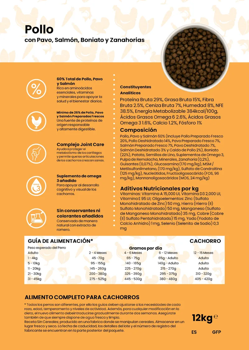 Pollo con Pavo, Salmón, Boniato y Zanahorias Cachorro 12 kg