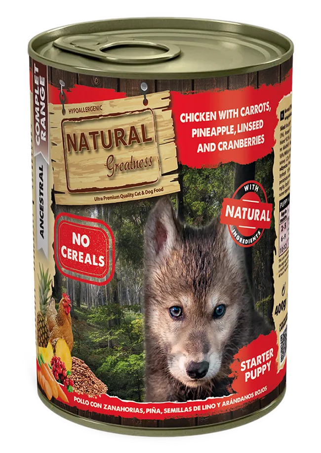 Natural Greatness POLLO CON ZANAHORIAS, PIÑA, SEMILLAS DE LINO Y ARÁNDANOS ROJOS es una excelente receta húmeda completa, ultraprémium, hipoalergénica y sin cereales desarrollada idealmente para cachorros a partir del destete. Este alimento incorpora carne de pollo de alta calidad como única fuente de proteína animal y proporciona todos los nutrientes necesarios para respaldar el buen desarrollo físico, cognitivo y neuronal del cachorro. Además, la receta cuanta con la inclusión de superalimentos tales como las zanahorias, la piña, las semillas de lino y los arándanos rojos, fuentes naturales de fibra, vitaminas, antioxidantes y carbohidratos saludables.