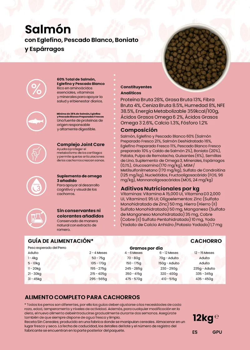 Salmón con Eglefino, Pescado Blanco, Boniato y Espárragos Cachorro 12 kg