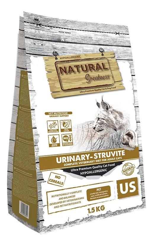 Natural Greatness Urinary-Struvite es una receta hipoalergénica, completa y sin cereales destinada a gatos adultos con urolitiasis por estruvita y cistitis idiopática felina. Este alimento se caracteriza por su poder de disolución y reducción de la aparición de cálculos de estruvita gracias a sus propiedades de acidificación de la orina y a su bajo contenido en magnesio. Urinary-Struvite también posee un contenido reducido en sodio, potasio y calcio para apoyar el buen funcionamiento del aparato urinario. Además, su fórmula antiestrés con proteína láctea hidrolizada contiene alfa-capsozepina, un ansiolítico natural que causa un efecto positivo en el sistema nervioso y circulatorio del gato.
